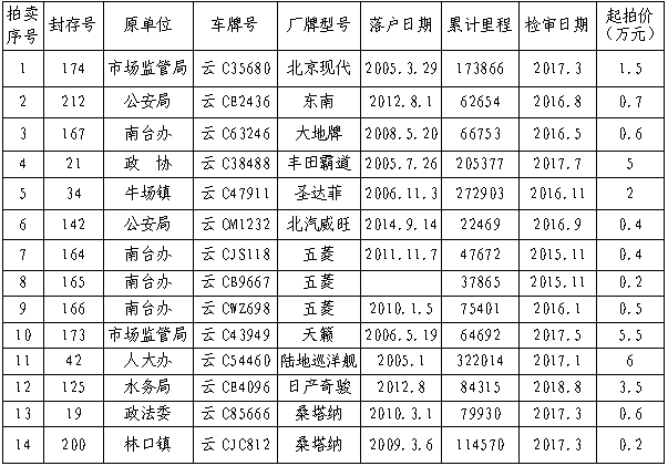 經(jīng)鎮(zhèn)雄縣人民政府批準,公開拍賣鎮(zhèn)雄縣公務用車改革取消車輛(第三期)14輛。相關事項如下: