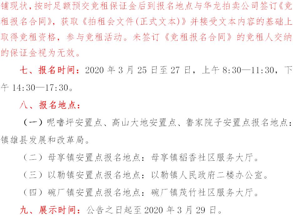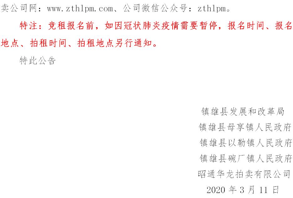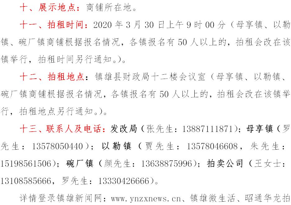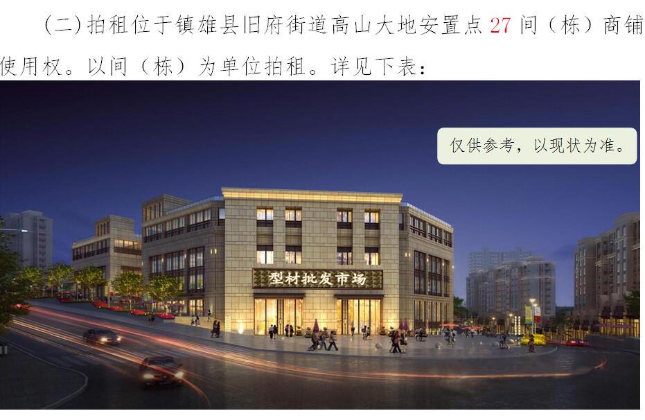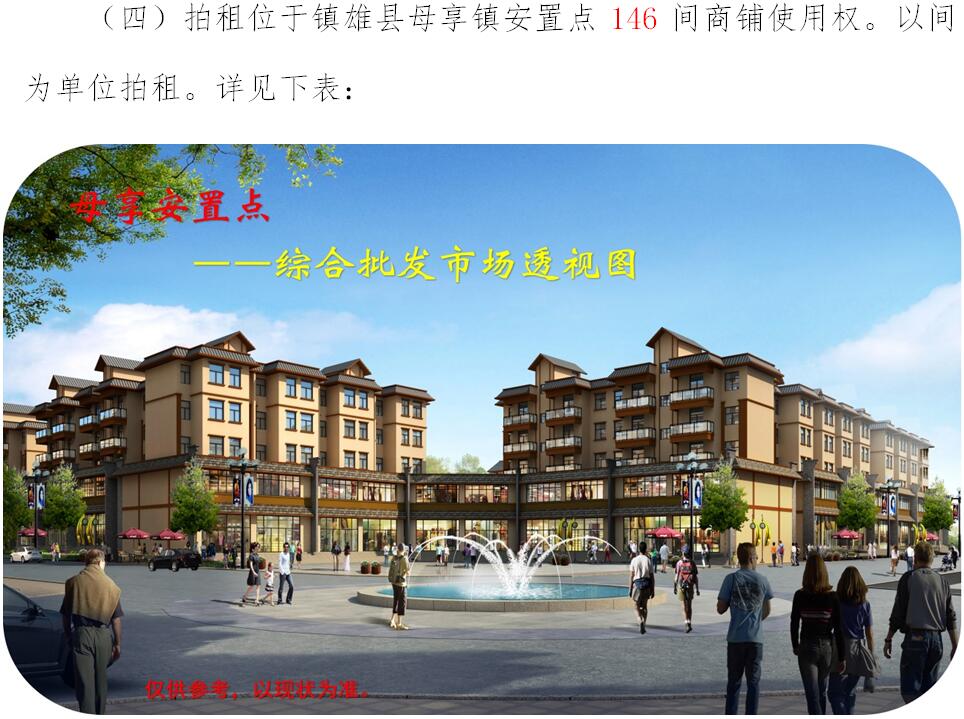 經(jīng)鎮(zhèn)雄縣人民政府批準,受相關部門(政府)委托,公開拍租位于鎮(zhèn)雄縣易地扶貧搬遷工程呢嚕坪安置點7棟獨立商鋪使用權、高山大地安置點27間(棟)商鋪使用權、魯家院子安置點24間(棟)商鋪使用權、母享安置點146間商鋪使用權、以勒物流城安置點67間(棟)商鋪使用權、碗廠安置點114間商鋪使用權。相關事項如下: